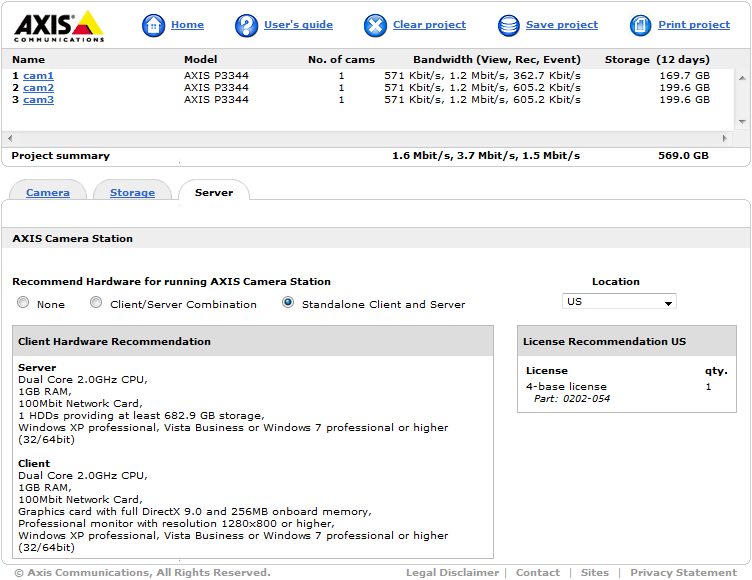 Как показала программа для расчета сервера мне необходимо закупить AXIS Camera Station One на четыре камеры.