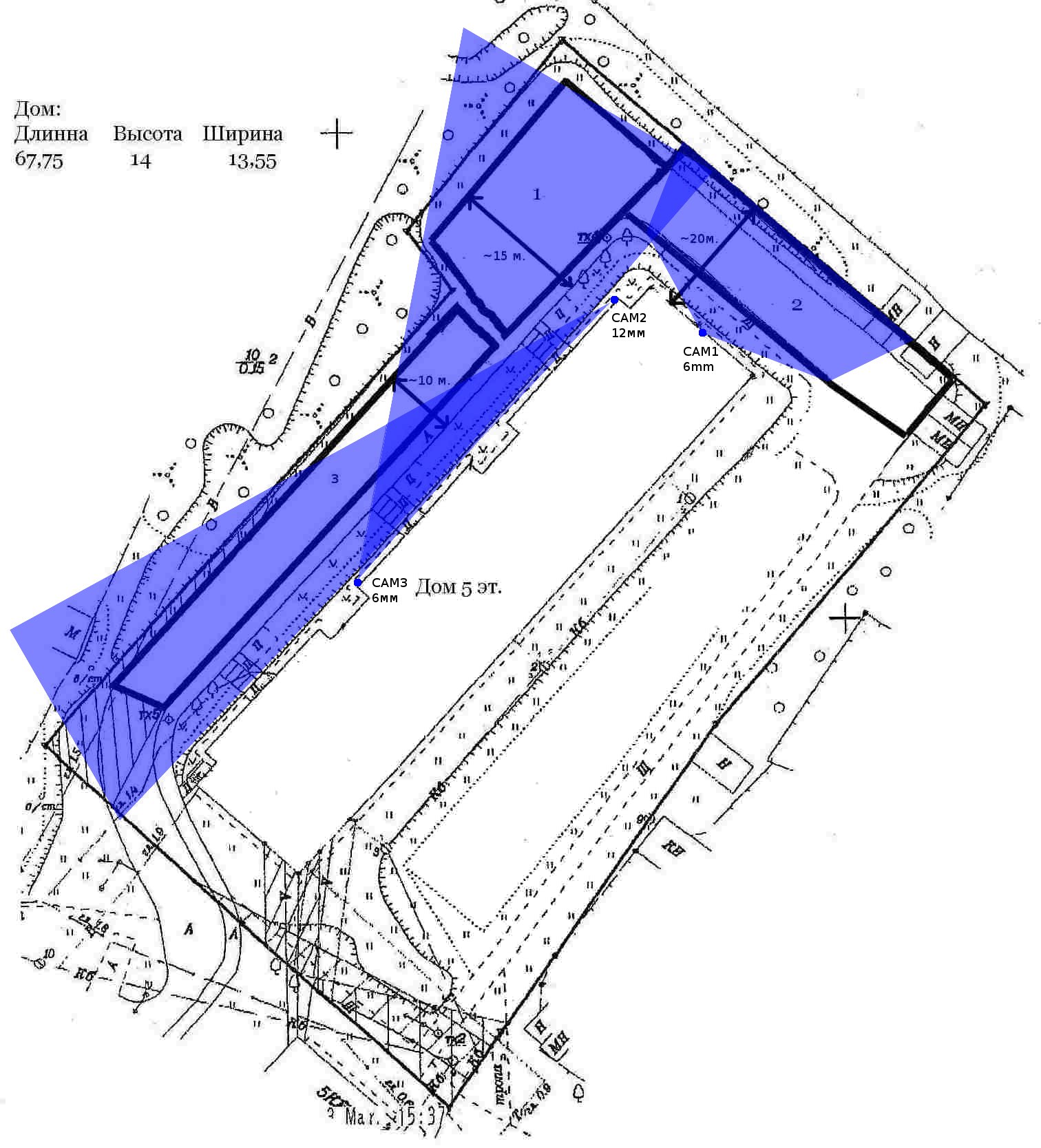 Из рисунка видно что CAM1 должна располагаться выше всех т.к. по углу просмотра на высоте 5 метров она не покрывала необходимую площадь, а она должна покрыть весь торец дома и в связи с этим принято решение установить ее выше всех т.е. на высоте 5го этажа. Следить за номерами\лицами это была не ее задача для этого есть камеры CAM2 и CAM3, которые смотрят перекрестно и вылавливают мелкие детали. Камеры CAM1 и CAM3 с оптикой 6мм для увеличения поля зрения и покрытия большей площади просмотра. CAM2 с 12мм оптикой для лучшего зуммирования и вылавливания дальних объектов с сокращением угла обзора.