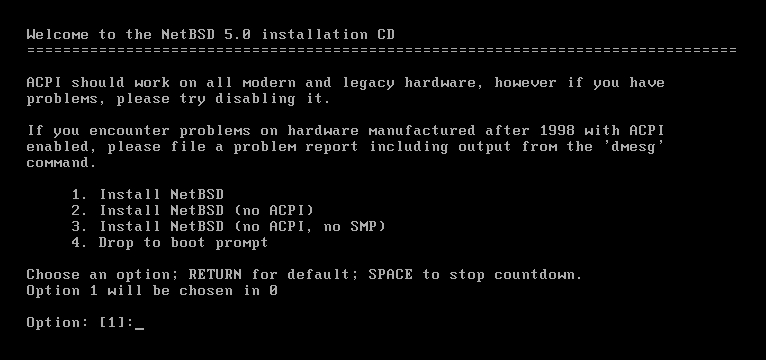 1) Запускаем виртуальную машину и грузимся с нашего установочного образа. На первом экране появляется меню с предложением выбрать тип установки или выйти в командную строку. Мы выбираем первый пункт (Install Netbsd) и жмём клавишу Enter.