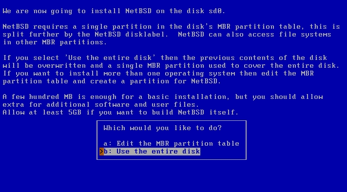 10) Теперь sysinst даёт пояснения по разметке диска и объёму разделов для установки NetBSD. Если выбрать пункт "Use the entire disk", то вся информация с него будет стёрта и он будет переразмечен. При желании, можно выбрать первый пункт меню и отредактировать таблицу разделов, оставив на диске уже существующие слайсы (разделы) и создав новый для нашей операционной системы. Однако, в данном случае, у нас такой необходимости нет, поэтому выбираем второй пункт меню для использования всего диска под NetBSD. Нажимаем Enter для продолжения.