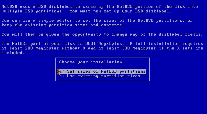 12) Теперь инсталлятор нам поясняет, что нужно сделать логические диски (партиции) в созданом разделе NetBSD и точки монтирования для доступа к ним. Делается это с помощью программы disklabel editor. Кроме того, здесь показана доступная ёмкость нашего диска (CF-карты) и минимальные объёмы, которые требуются для установки ОС NetBSD. В моём случае, доступный объём диска составляет аж 3831 мегабайт, а для базовой установки NetBSD достаточно всего 288 мегабайт без графической системы X Window (графического интерфейса) и 338 мегабайт с установкой графики. Так что у меня места более чем достаточно. Тут же задаётся вопрос, хотим ли мы сами установить размеры логических дисков с привязкой к точкам монтирования или же будем использовать уже существующую разметку. Выбираем первый пункт для редактирования логической структуры раздела и нажимаем Enter.