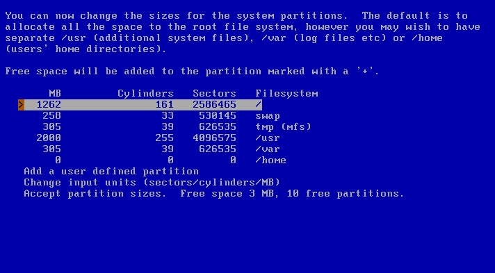 14) На следующем экране просто ещё раз проверяем созданную таблицу (разметку) и подтверждаем её верность выбором последнего пункта (Partition sizes ok). Здесь же показано какие файловые системы будут созданы на соответствующих партициях (логических дисках). В данном случае это FFS первой версии.