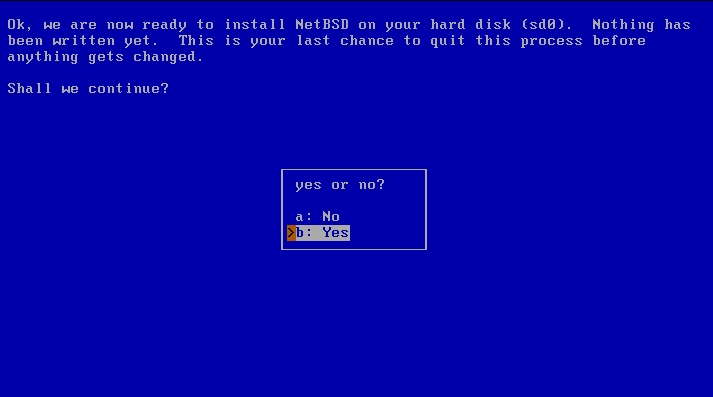 5) На следующем экране даётся пояснение о том, какие шаги нужно выполнить для установки ОС NetBSD и спрашивается будем ли мы продолжать. Выбираем Yes и идём дальше.