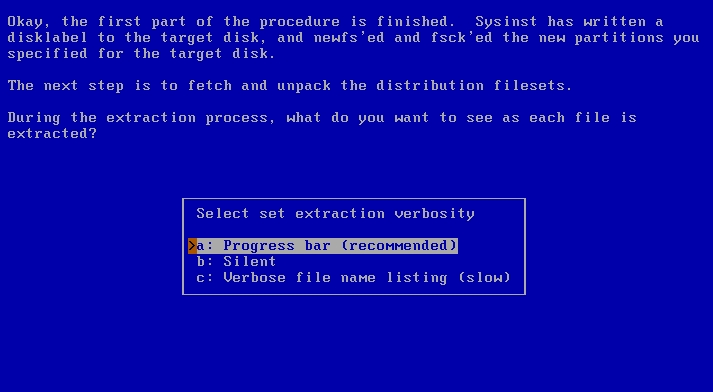 19) Теперь sysinst сообщает нам, что первая часть установки (то есть разметка диска и запись в MBR) закончена и можно приступать к установке дистрибутивных пакетов (filesets). Для удобства наблюдения за этим процессом нам предлагается выбрать строку индикации (progress bar) или же наоборот, отключить её (Silent) для экономии ресурсов системы, а также выводить название каждого файла отдельно. Я выбрал первый вариант.