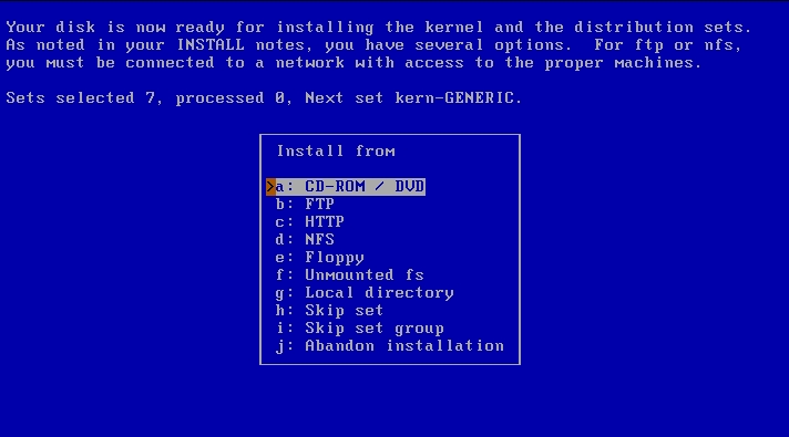 21) На следующем экране мы видим как инсталлятор определил виртуальный CD-ROM и из какой папки он собирается брать дистрибутивные пакеты. Если название устройства или путь к каталогу пакетов неверен, можно его подкорректировать простым нажатием клавиши Enter на соответствующем пункте. Но в моём случае это не требуется, так как CD-привод у меня один, а образ установочного диска был скачан с официального сайта ftp.netbsd.org. Кстати, тут следует обратить внимание на обозначение оптического диска в системе NetBSD (cd0a), это потом пригодится при монтировании. Для начала установки пакетов выбираем пункт "Continue" и нажимаем Enter.