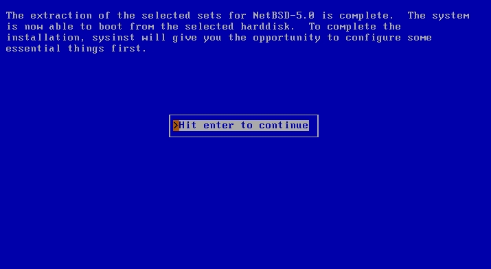23) По завершению установки появляется победная надпись о том, что теперь ОС NetBSD может грузиться с нашего диска (то есть с нашей CF-карты). Осталось только сделать первоначальную настройку операционной системы. Нажимаем Enter и начинаем настраивать.