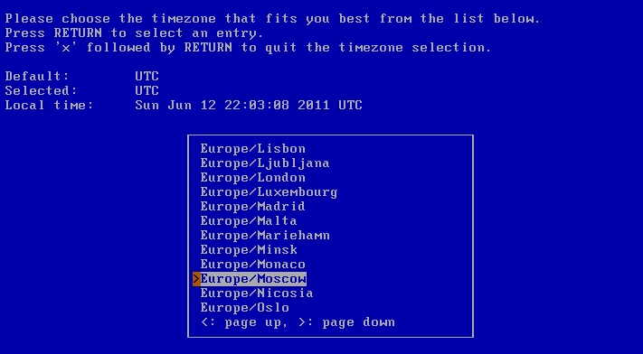 24) В первую очередь устанавливаем временную зону для нашей системы. Например для московского времени нужно выбрать Europe/Moscow.